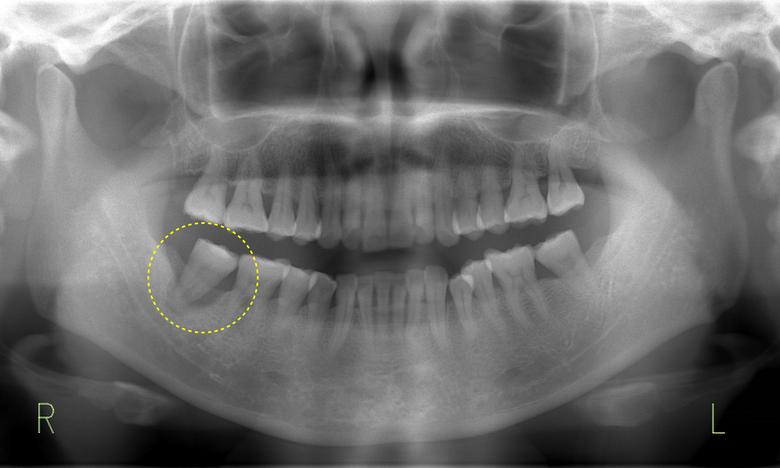 お口の中は全体的に良好な状態に見えましたが、下の奥歯に「限局型慢性歯周炎(ステージ3 グレードC)」が判明し保存が極めて難しい状態に。ここから歯周組織再生療法による回復を試みました。
