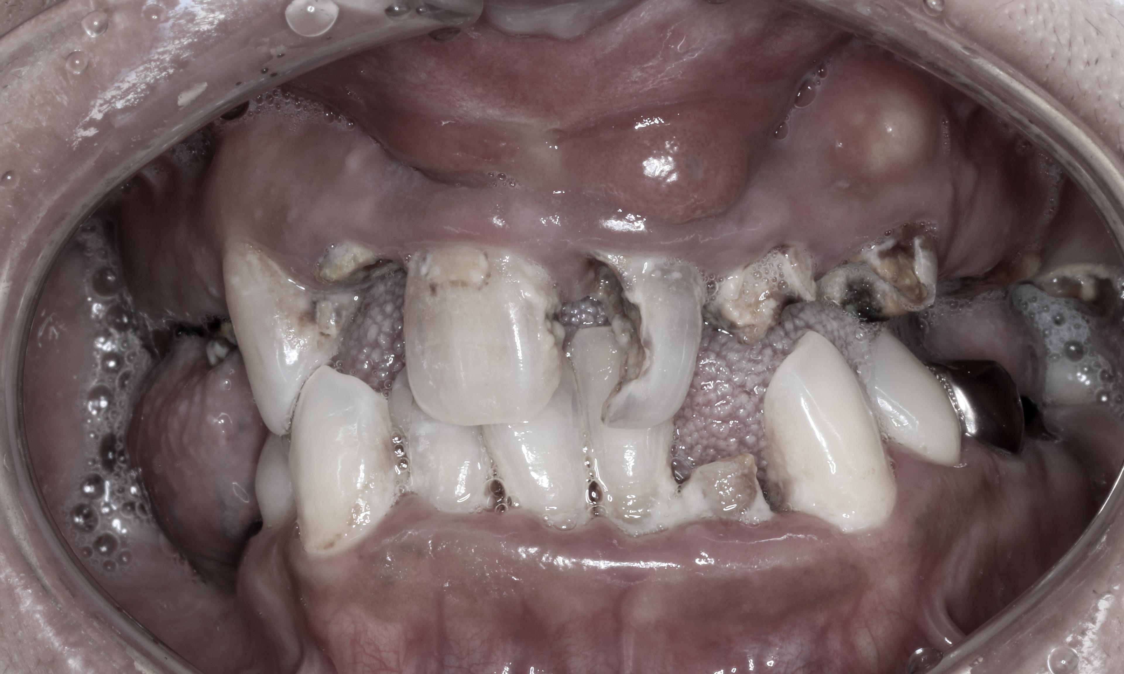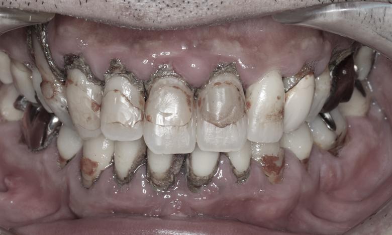 大病を患っていたことから口腔ケアが出来ず重度歯周病と歯冠崩壊が進んでしまったケースです。矯正治療とインプラント治療を組み合わせ、可能な限り天然歯を保存して口腔再建を行いました。