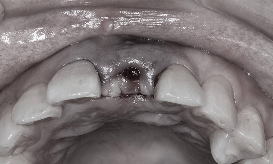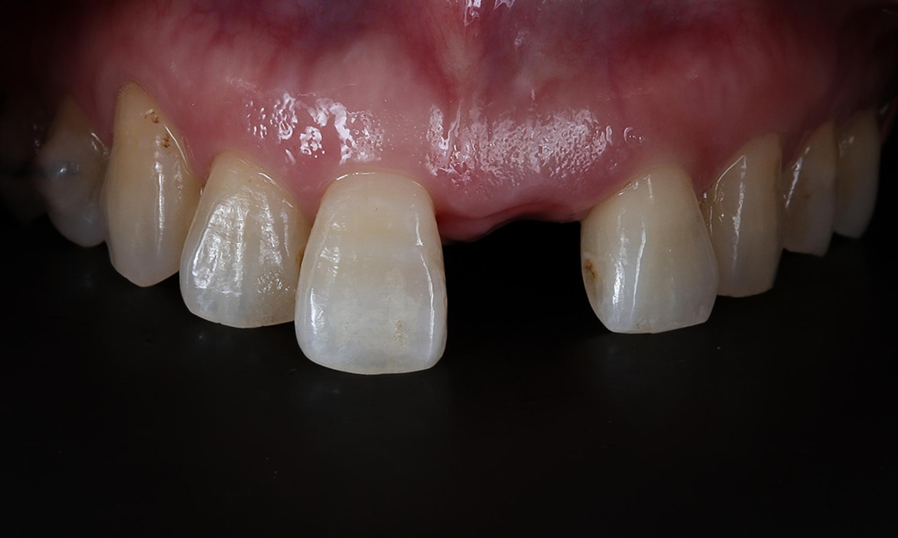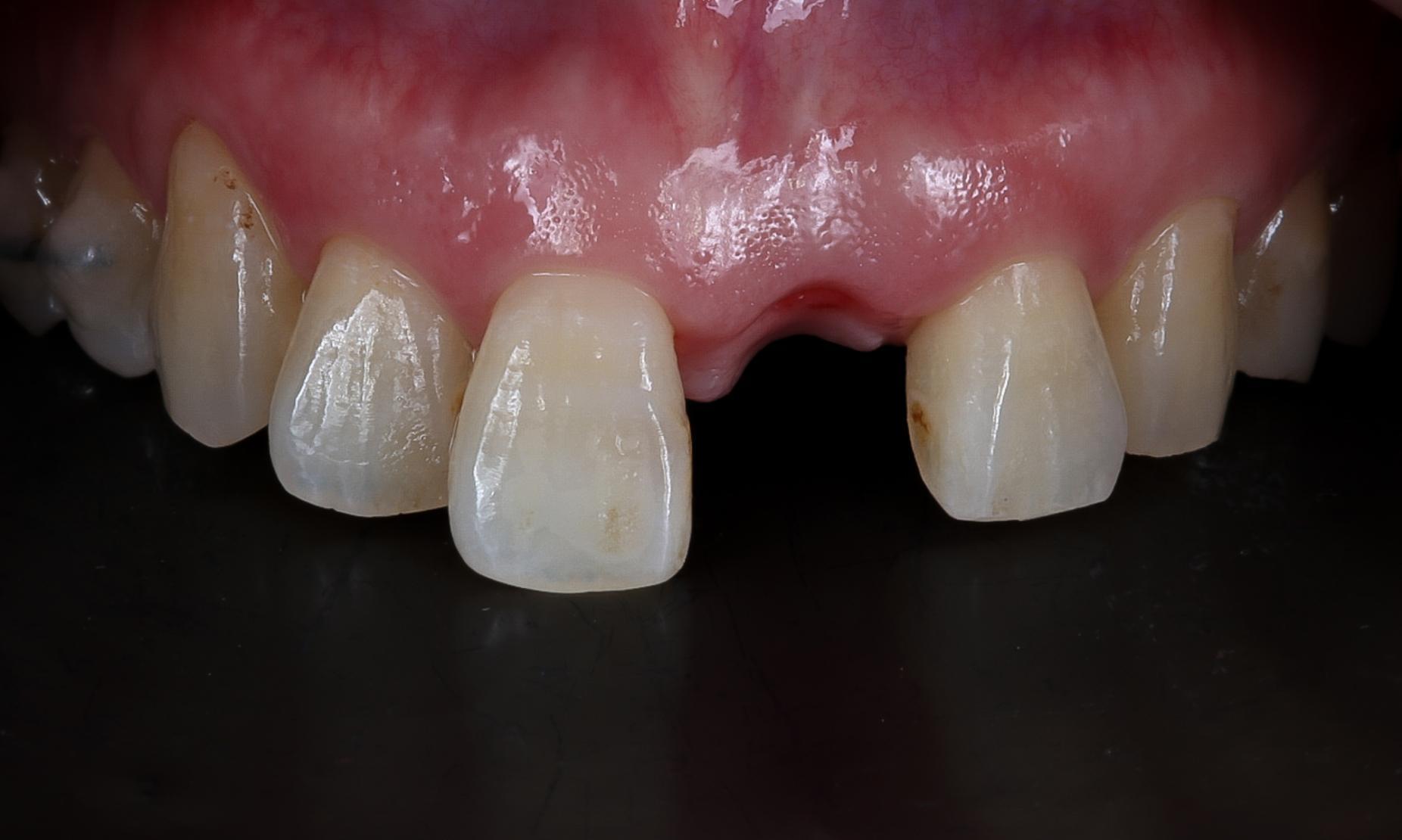 この方は44歳の女性で、左の前歯が1本欠損した状態でご来院されました。原因は◯◯による外傷で歯を折ってしまい、他院で保存が難しいと診断され、抜歯を余儀なくされたとのことです。抜歯後にインプラント治療を希望されましたが、同じく◯◯の影響でインプラントが困難と言われ、部分的な入れ歯か、隣接する健康な歯を削ってブリッジ治療を行うしかないと提案されました。