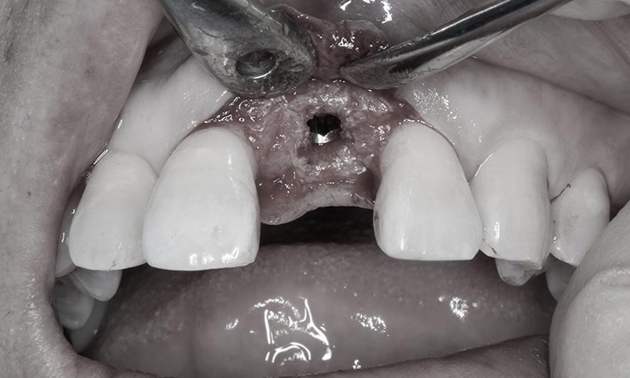 インプラント埋入と同時に結合組織移植術のために、部分層弁という手法で一部の歯茎を慎重に剥がします。