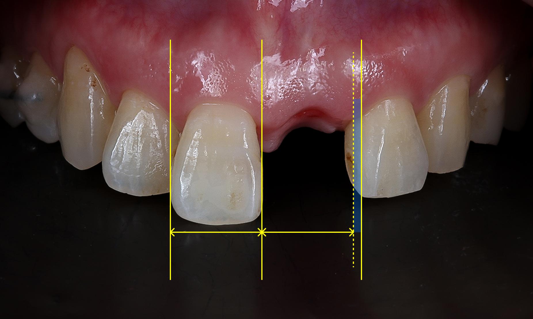 初診時のお口の状態を確認したところ、左右の前歯のスペースが揃っていないことが判明しました。このままでは左側のインプラントを挿入すると不自然に大きな歯となり、審美性が損なわれるリスクがありました。