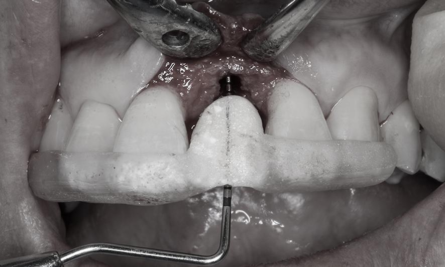 シミュレーション通りの位置にインプラントを埋入出来るようにステントと呼ばれる(透明な樹脂の部分)埋入ガイドを使い、正確性と安全性を確保しています。