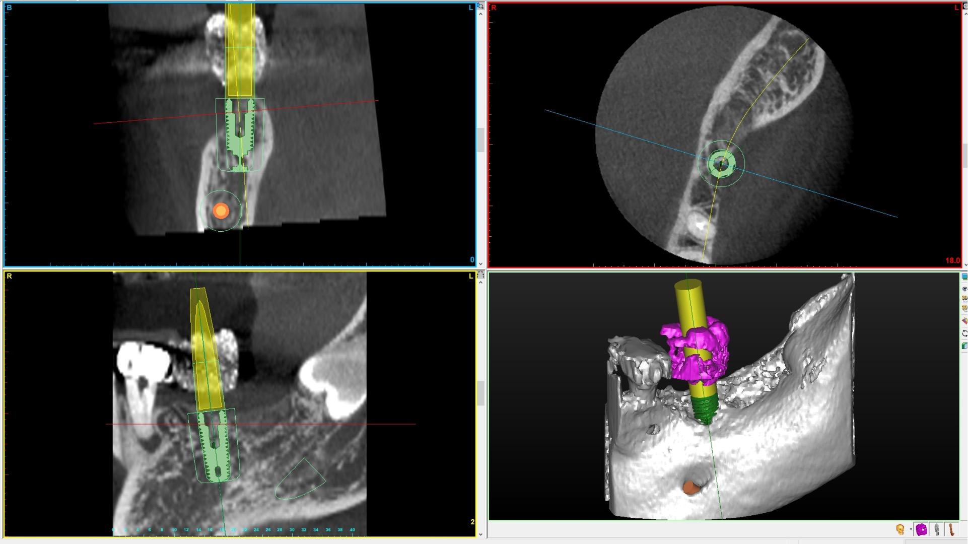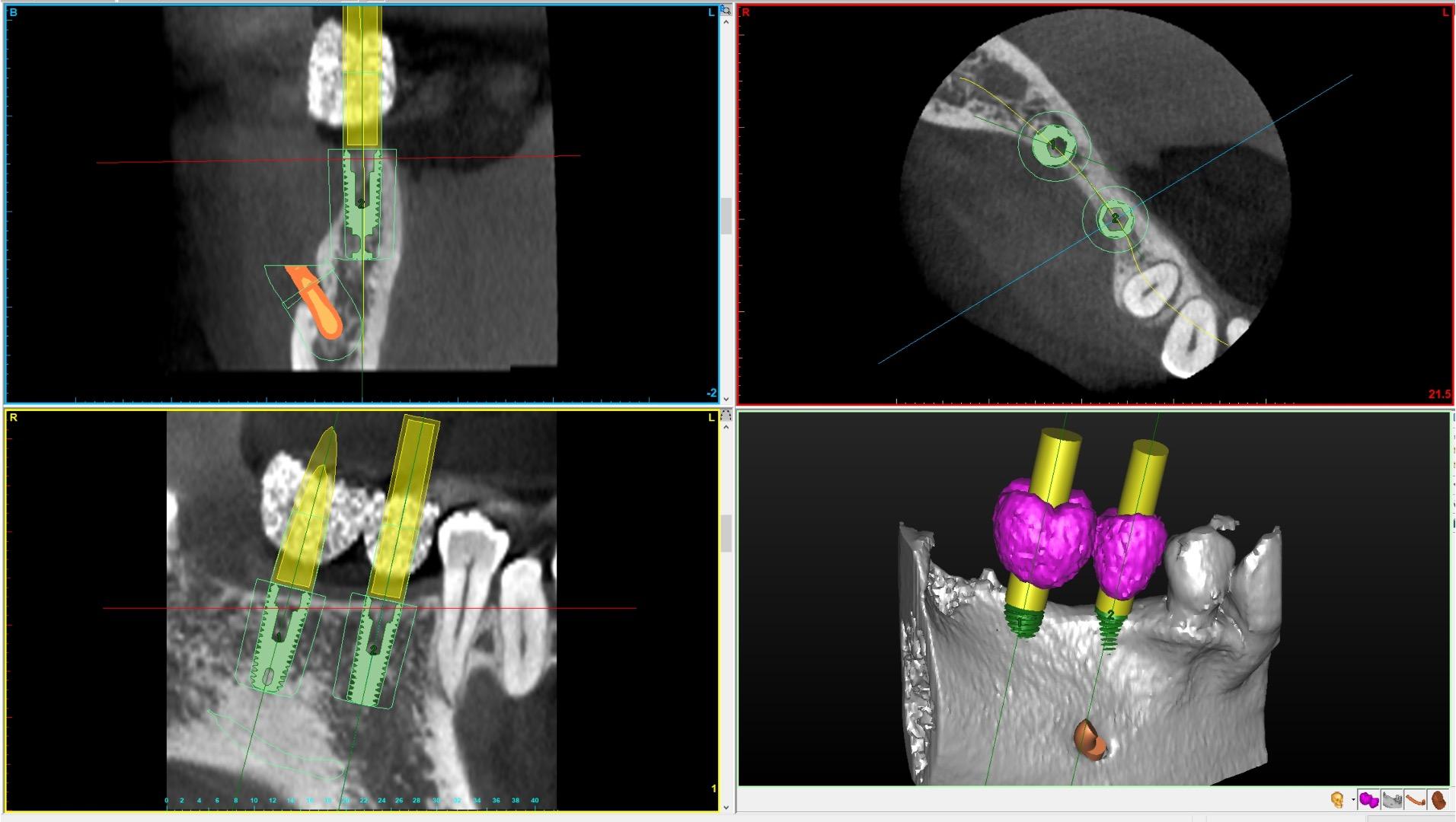 診断用ワックスアップ(シミュレーション模型)を反映したインプラント手術用ステント(埋入ガイド)を用いて、コンピューター上でシミュレーションを行います。