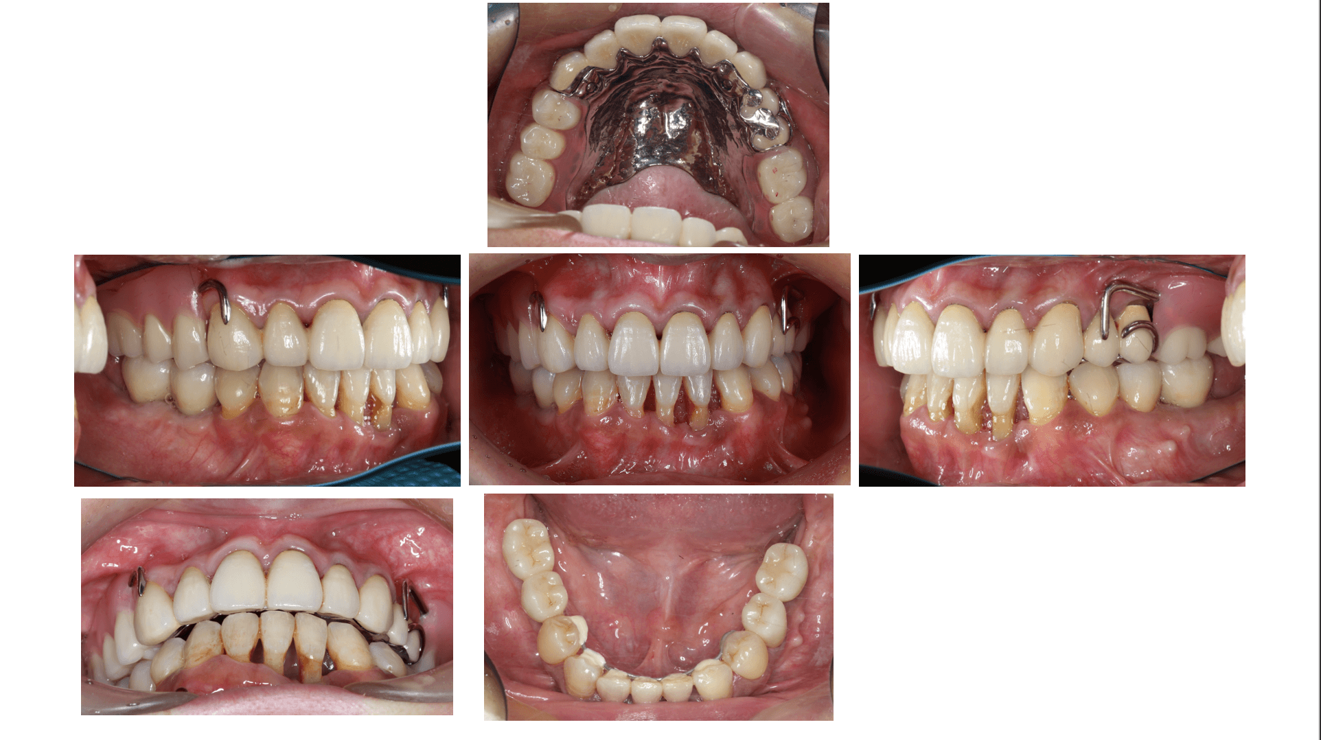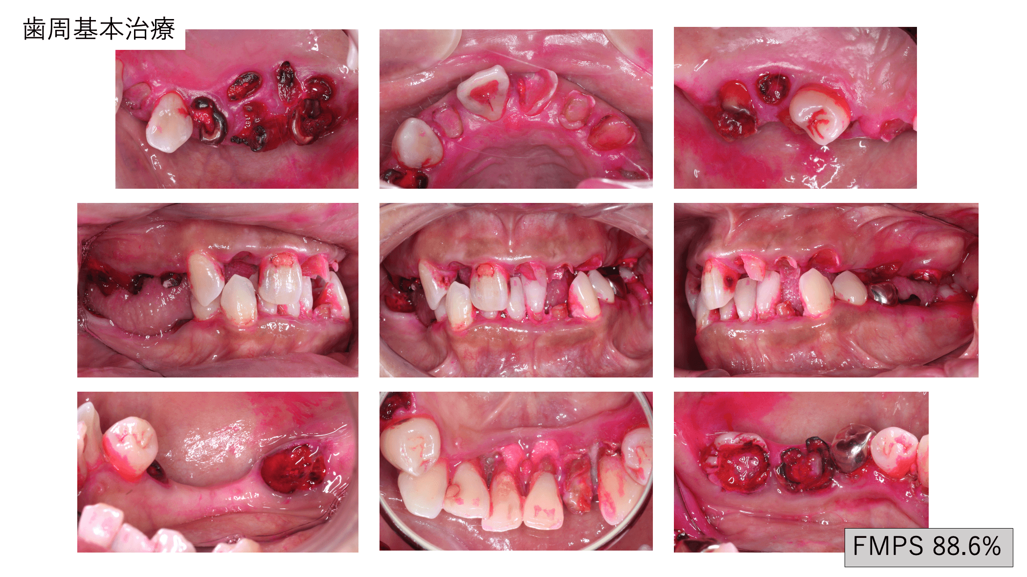 再評価時の口腔内写真です。この頃には、患者様が治療に対し前向きになってきたことを感じました。BS(出血スコア)は26%にまで改善しています。この段階で見た目と機能の回復を図るため仮歯を装着しました。これと並行して抜歯等も行っています。