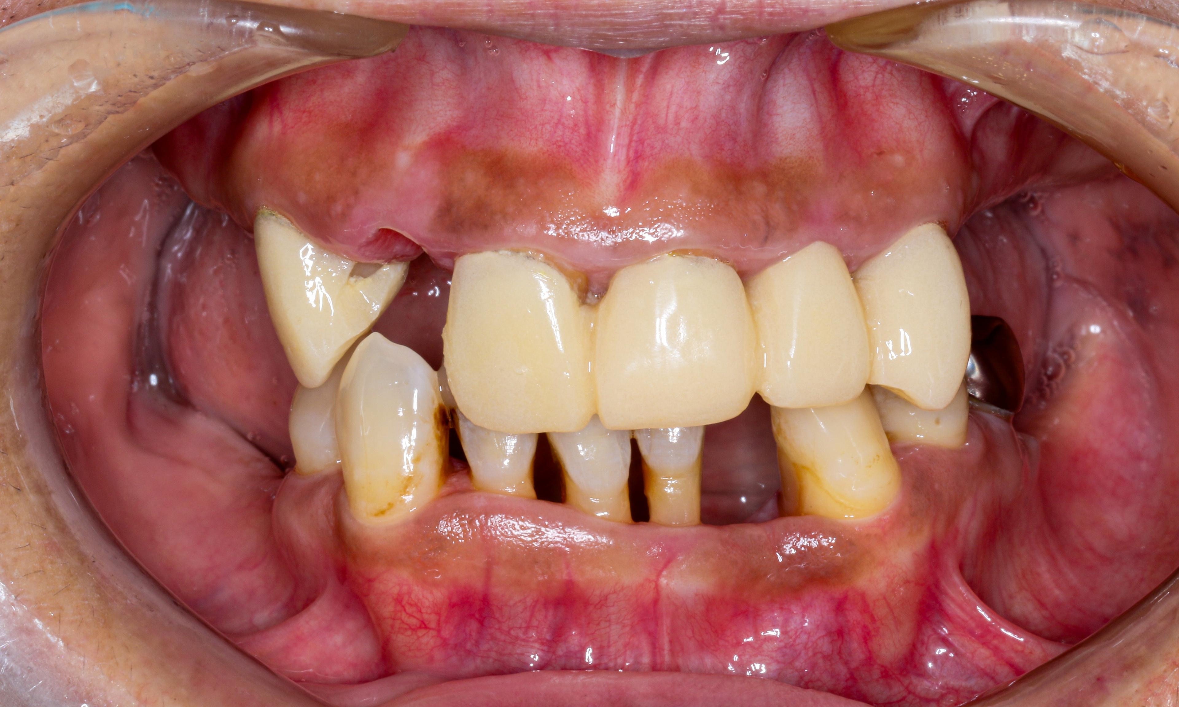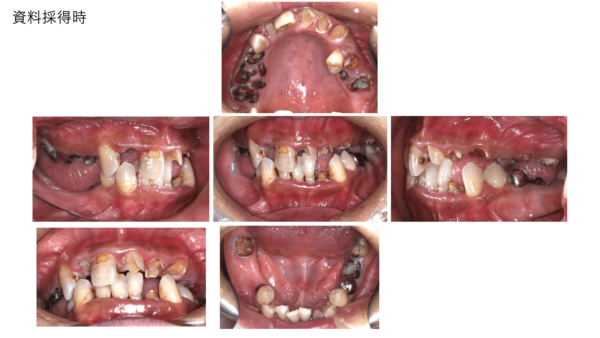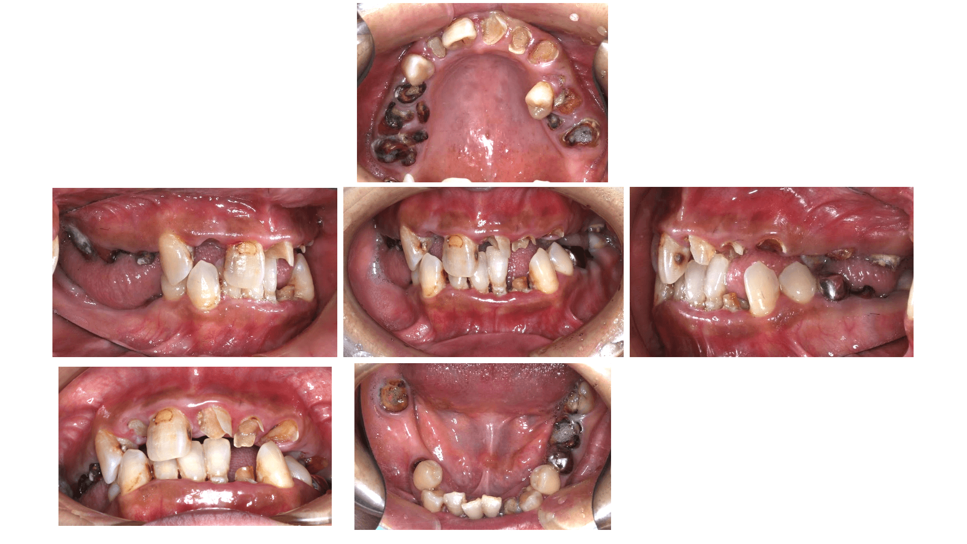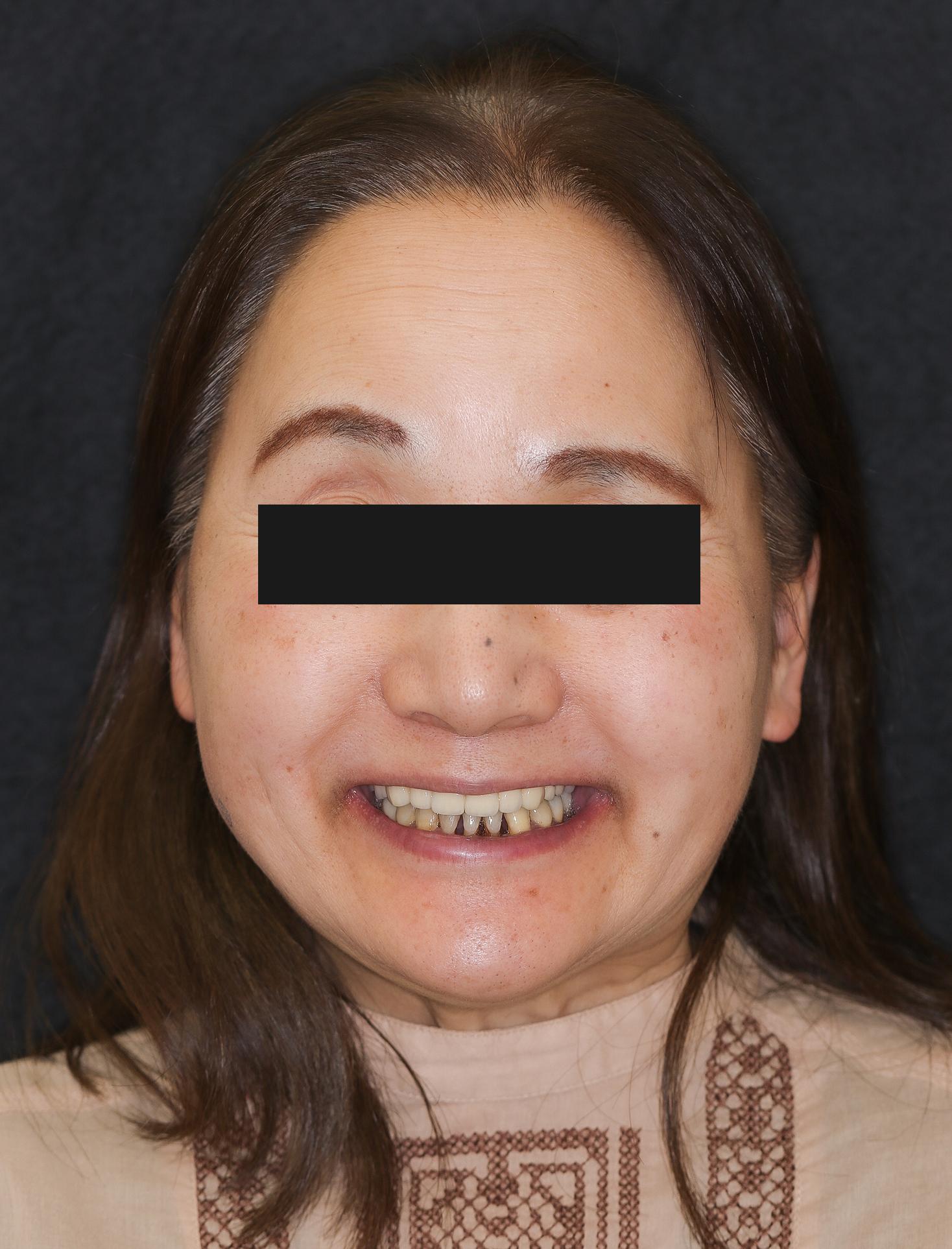 大病を患っていたことから口腔ケアが出来ず重度歯周病と歯冠崩壊が進んでしまったケースです。矯正治療とインプラント治療を組み合わせ、可能な限り天然歯を保存して口腔再建を行いました。