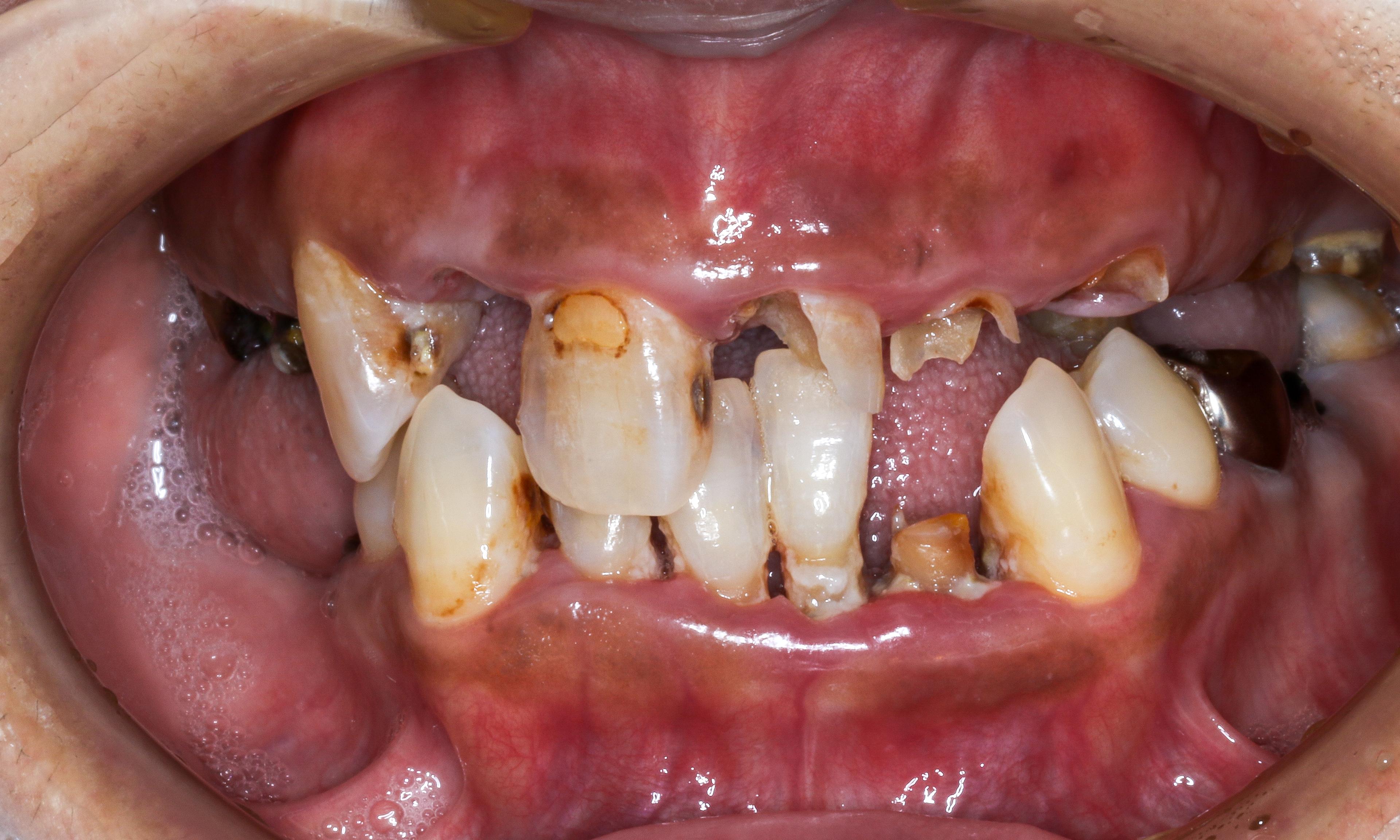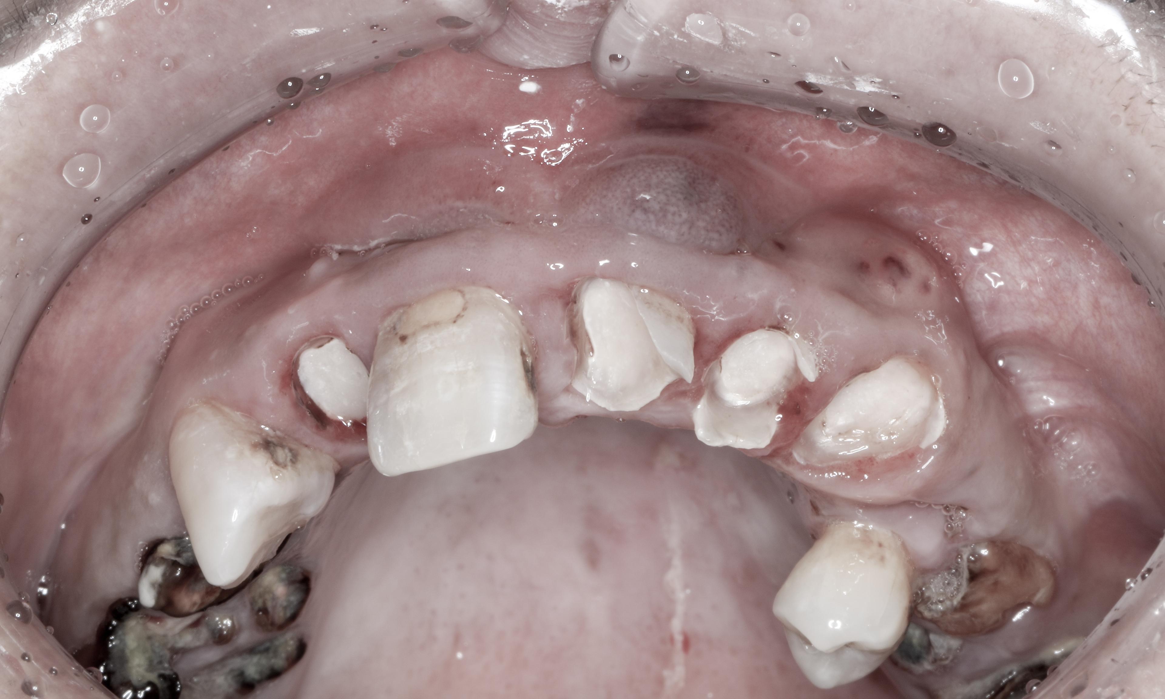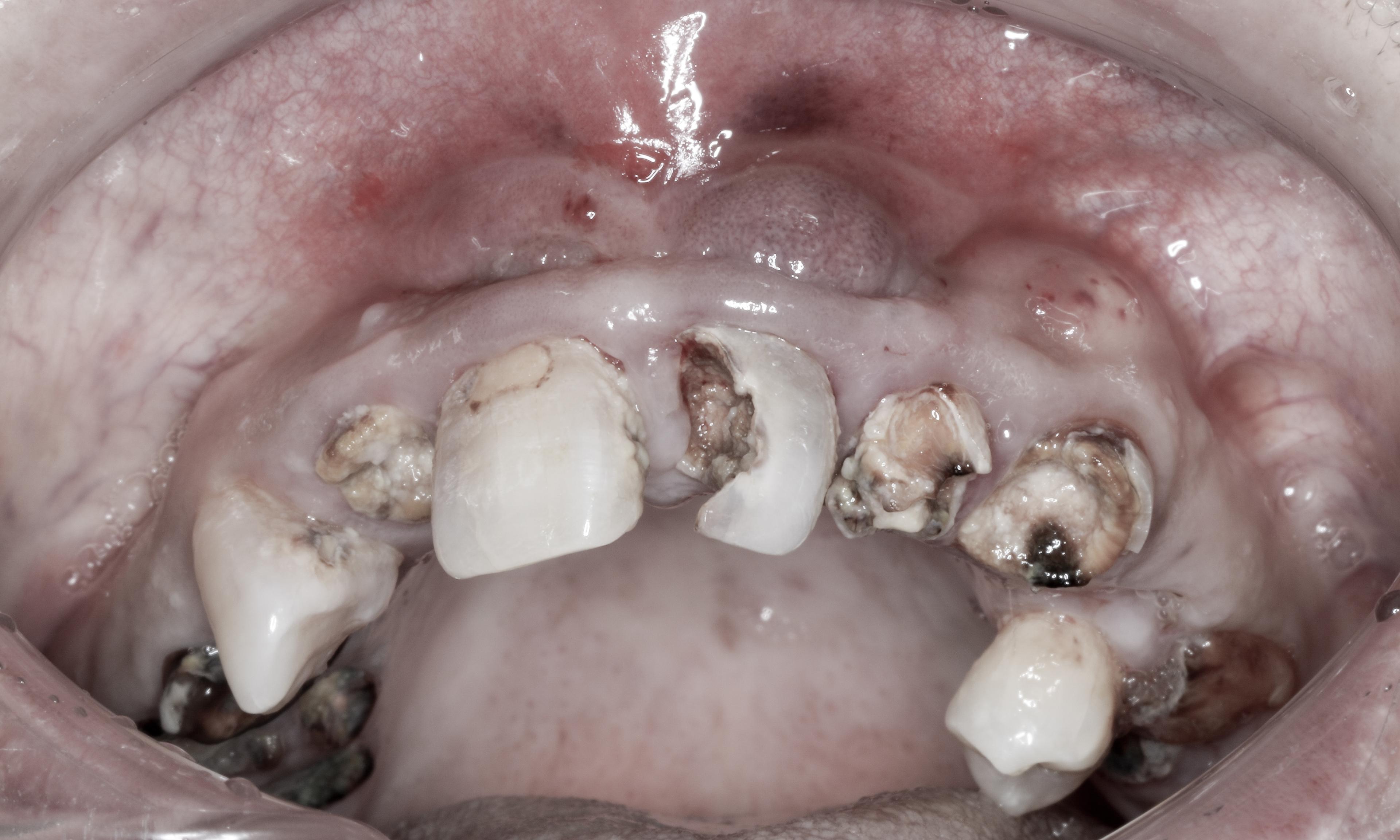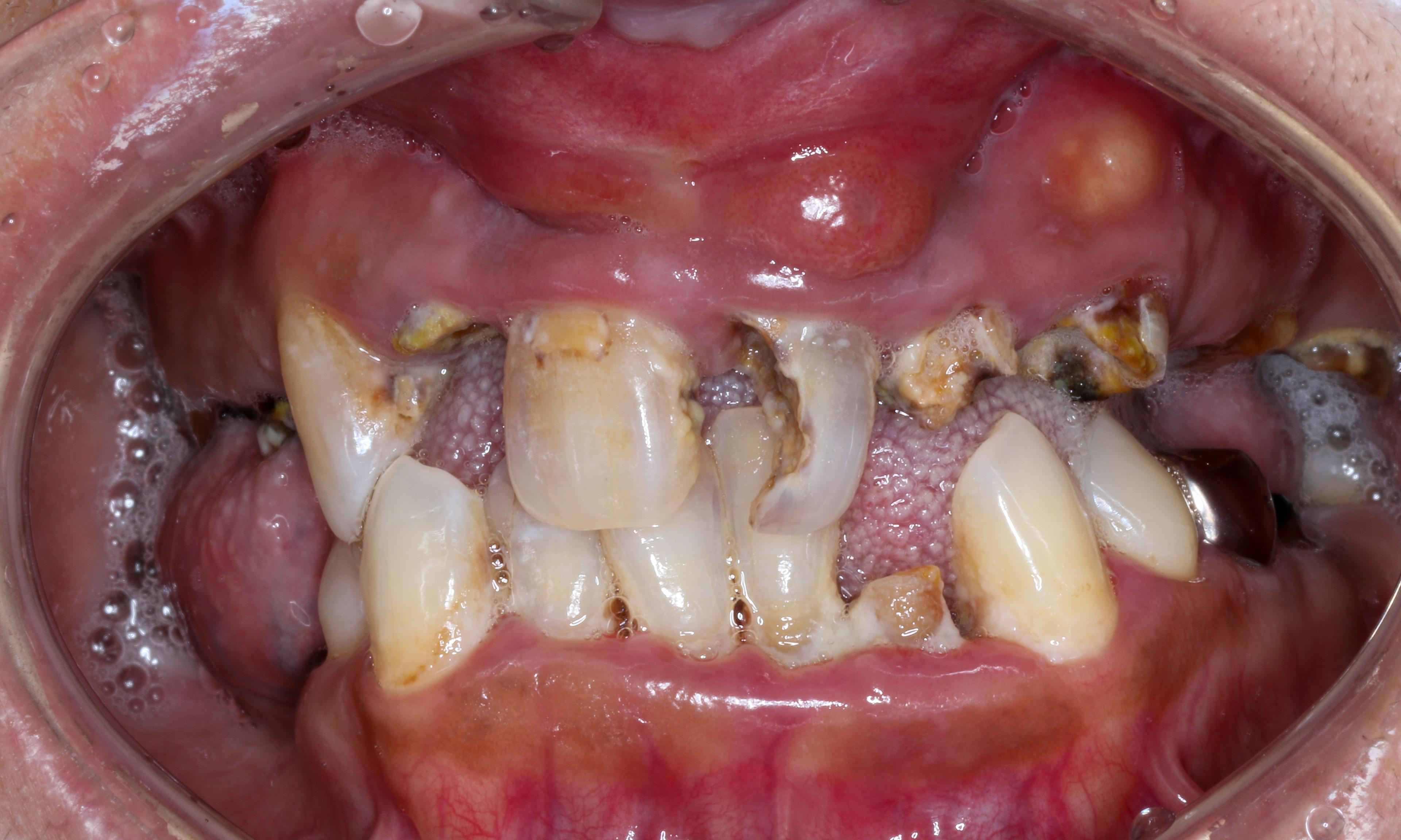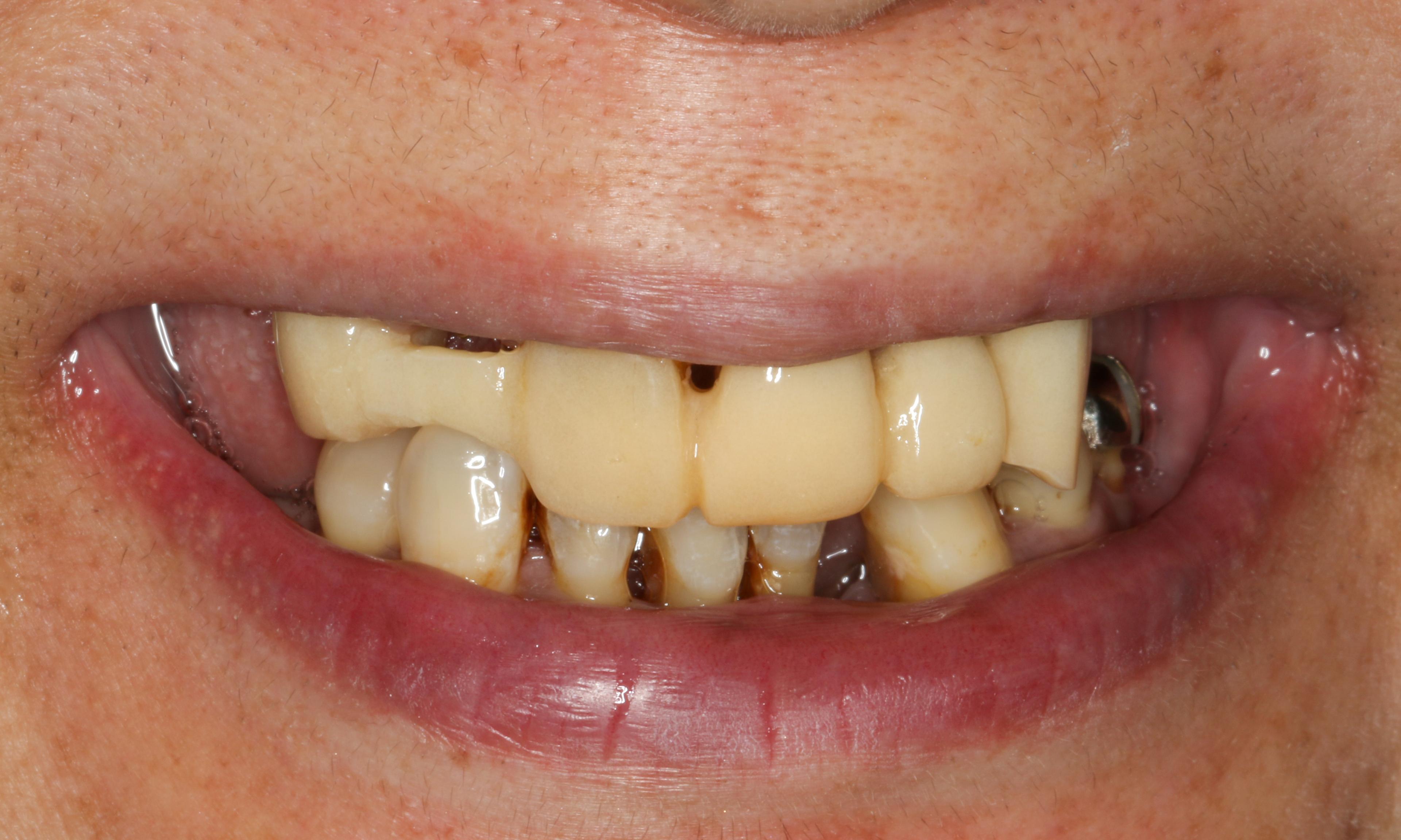 大病を患っていたことから口腔ケアが出来ず重度歯周病と歯冠崩壊が進んでしまったケースです。矯正治療とインプラント治療を組み合わせ、可能な限り天然歯を保存して口腔再建を行いました。