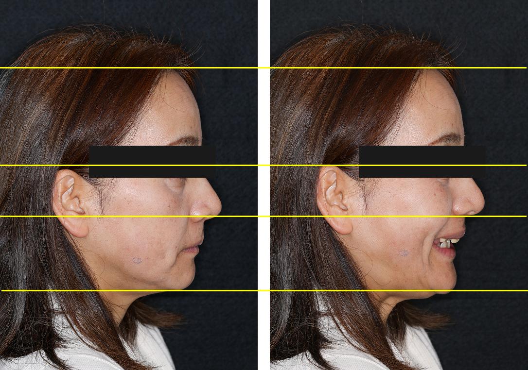 正面観:で調整してますが、中切歯切端の位置と咬合高径は適正と考えました。