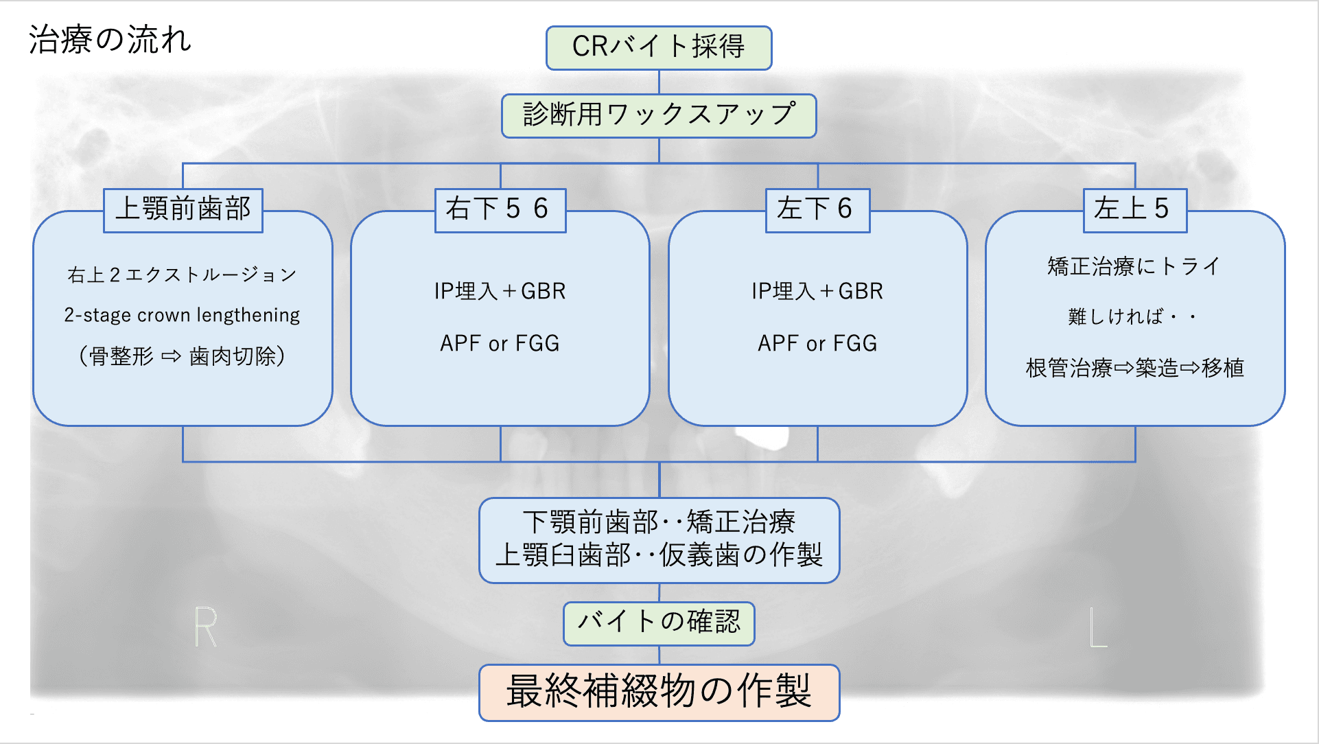 - 右下のインプランは骨が足りないので骨再生治療と歯茎の高さ調整