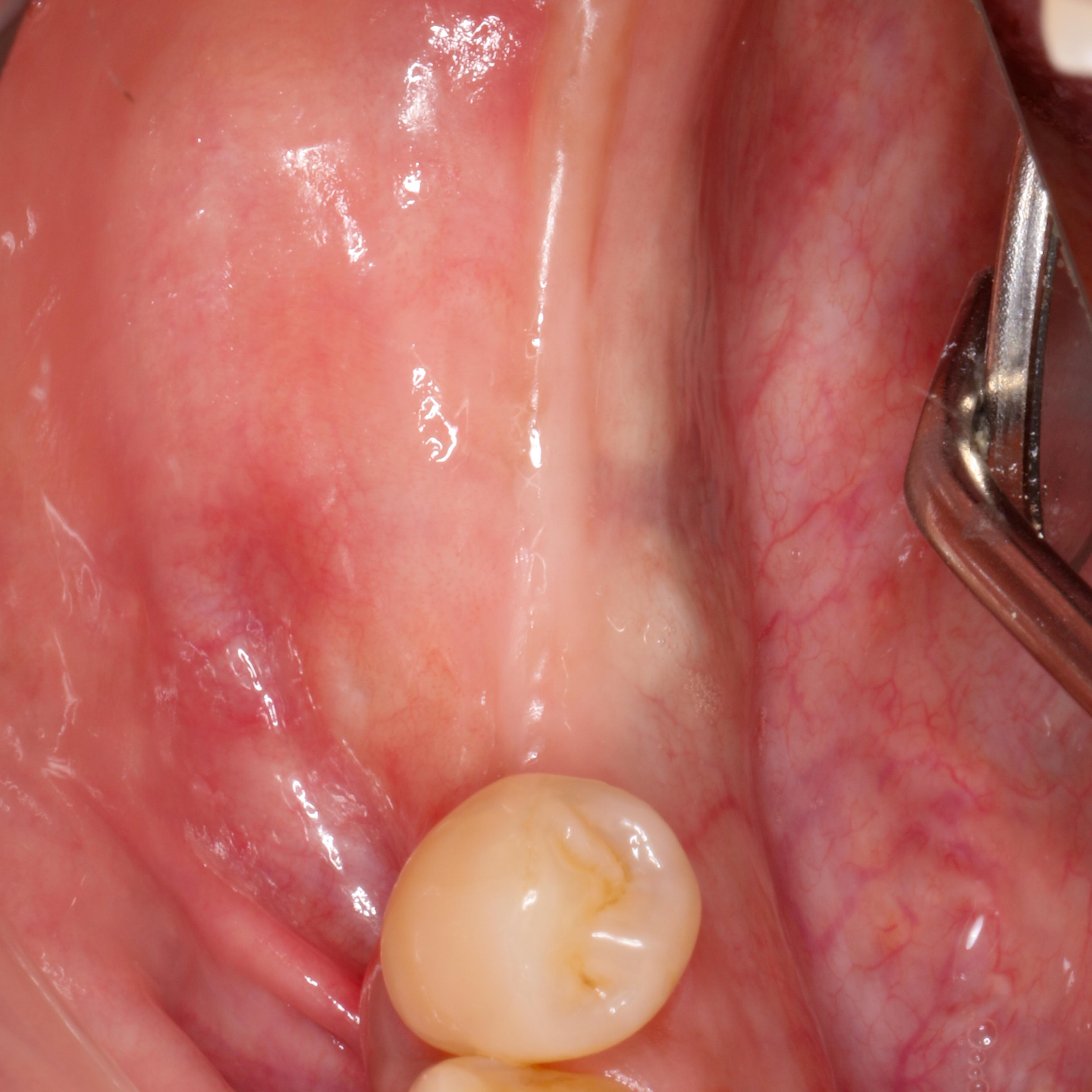 GBR後6ヶ月で頭出しを行いました。ハニカムメンブレン除去後、角化組織が十分あるので、APFのみで対応しています。