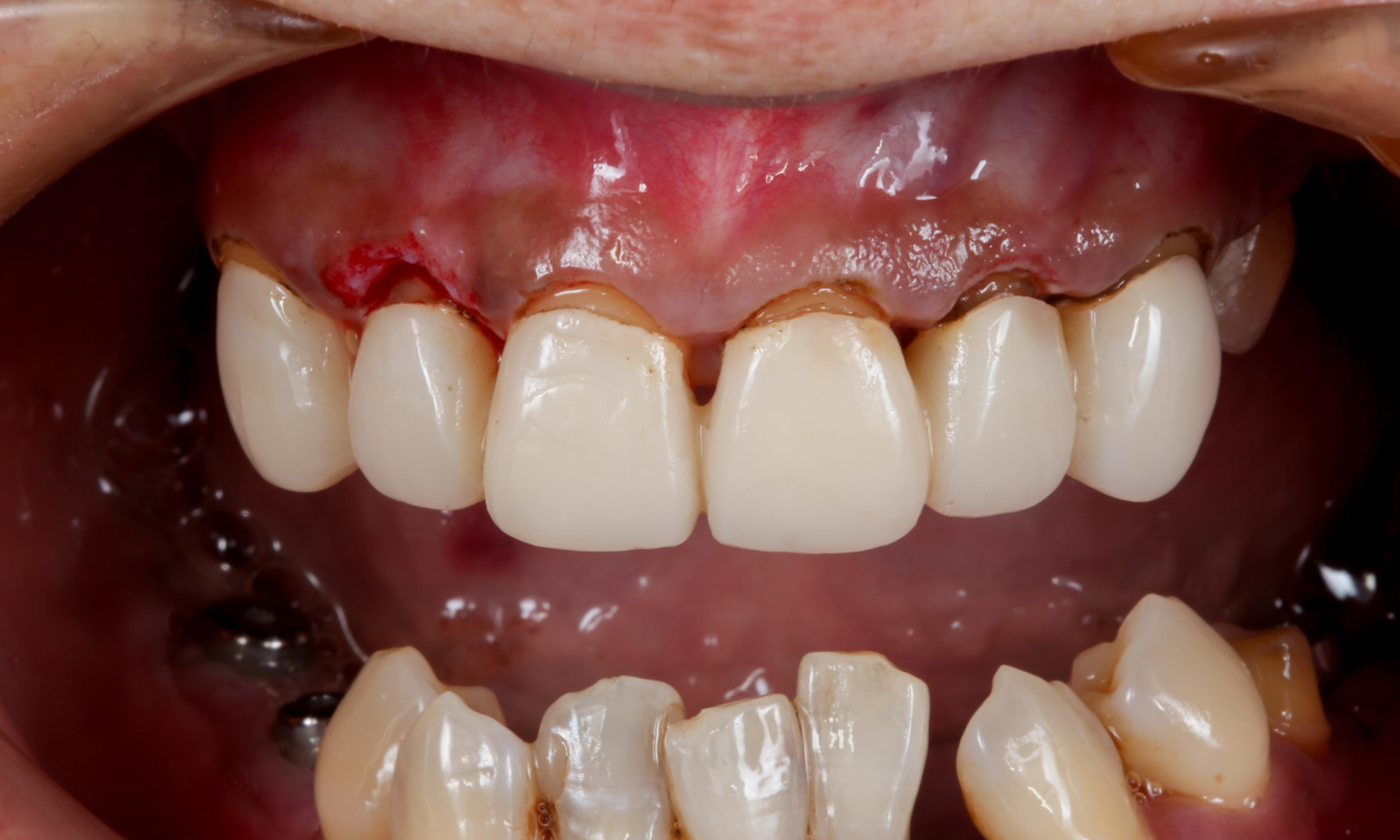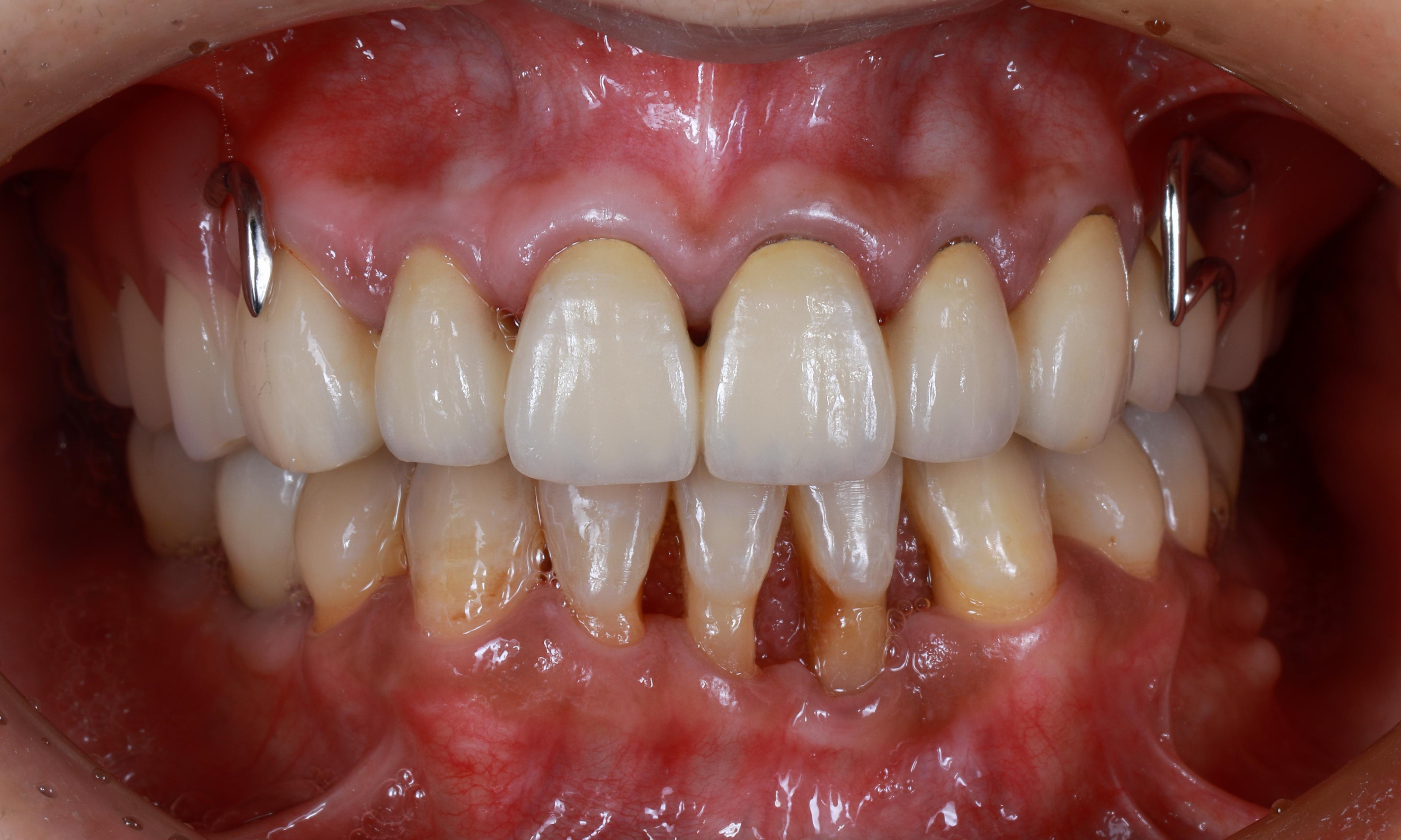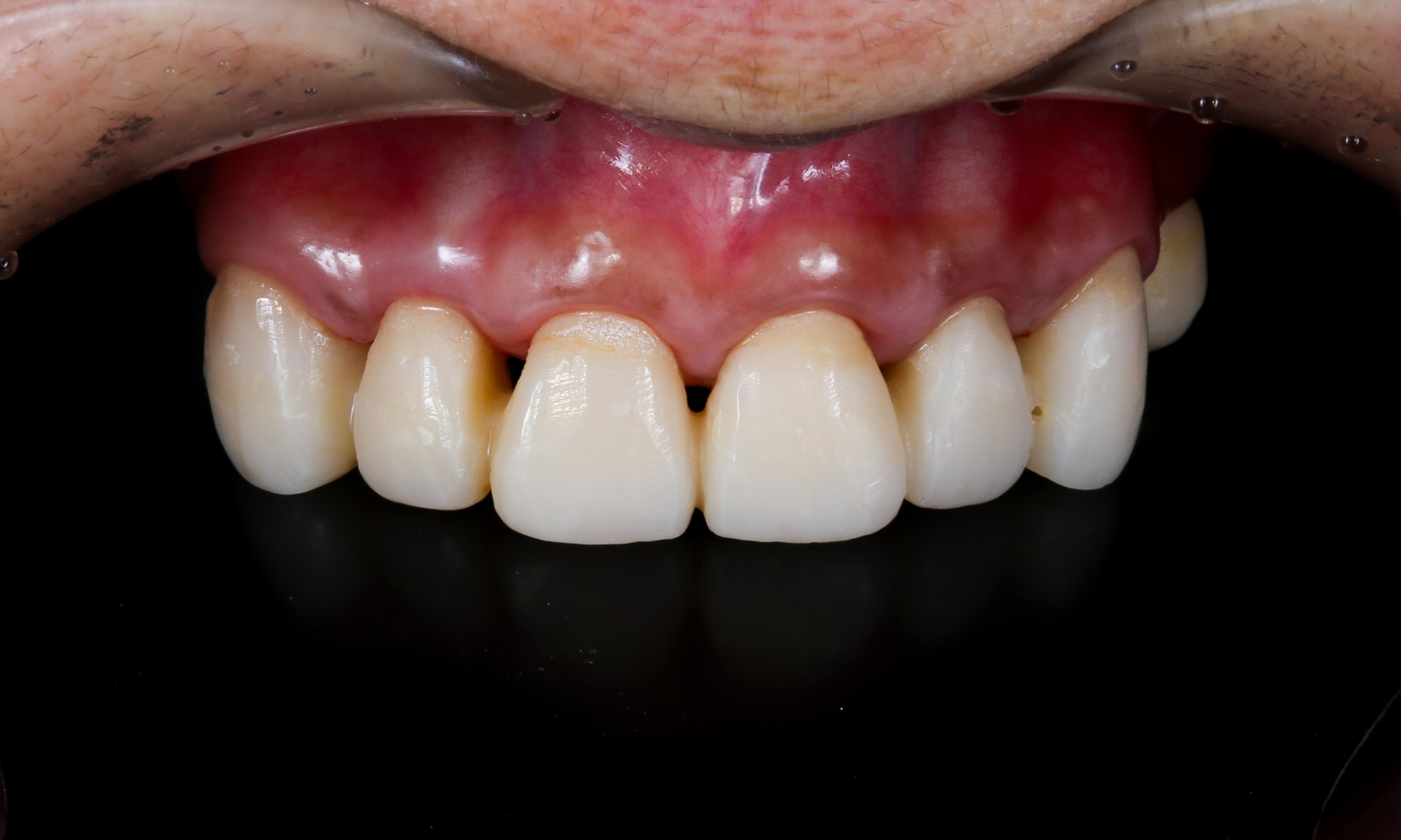 骨整形後2ヶ月で歯肉切除を行い、そこから6ヶ月後、歯肉レベルが安定していると判断したので、改めて歯肉縁下に支台歯形成を行い、プロビジョナルレストレーション(仮歯)を修正し理想の形にしました。