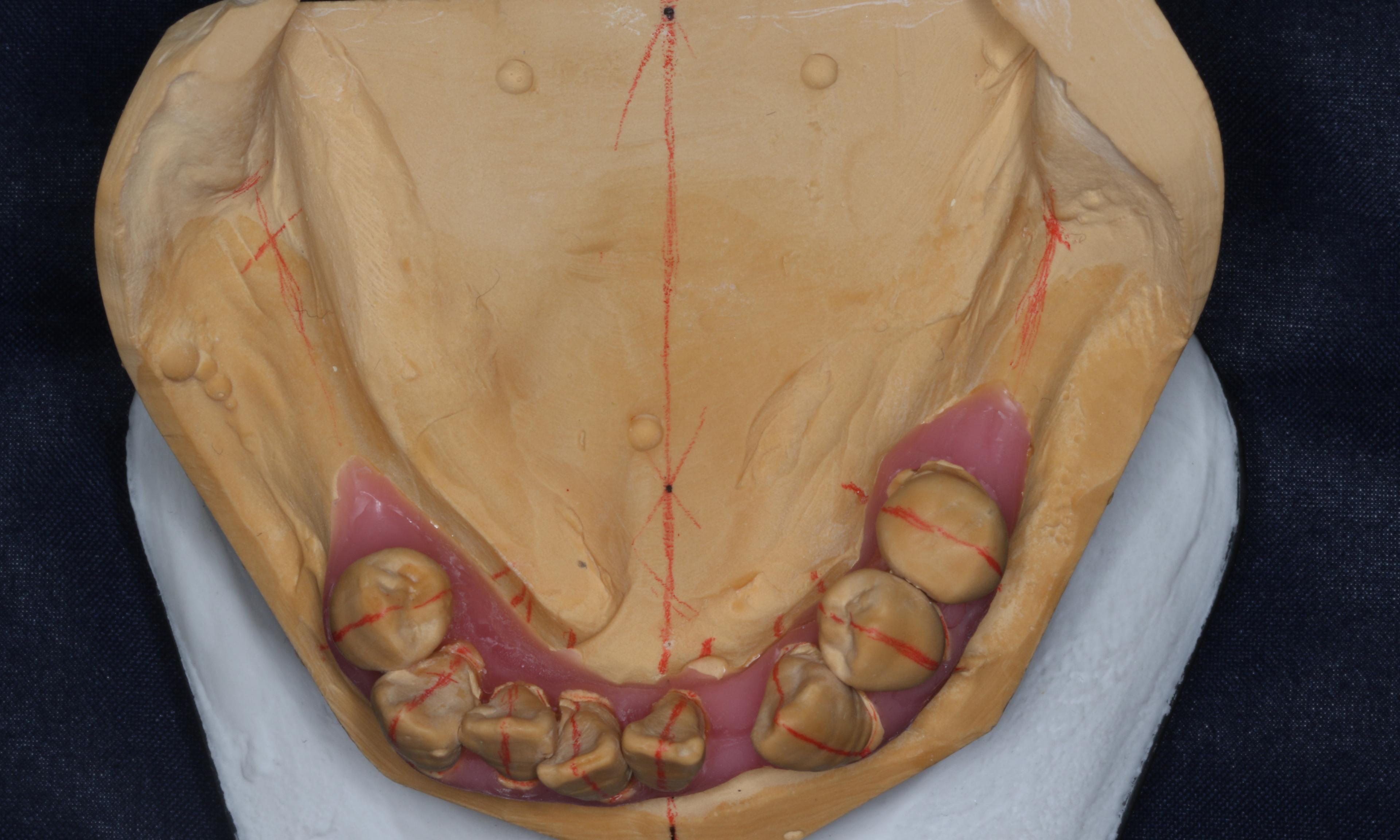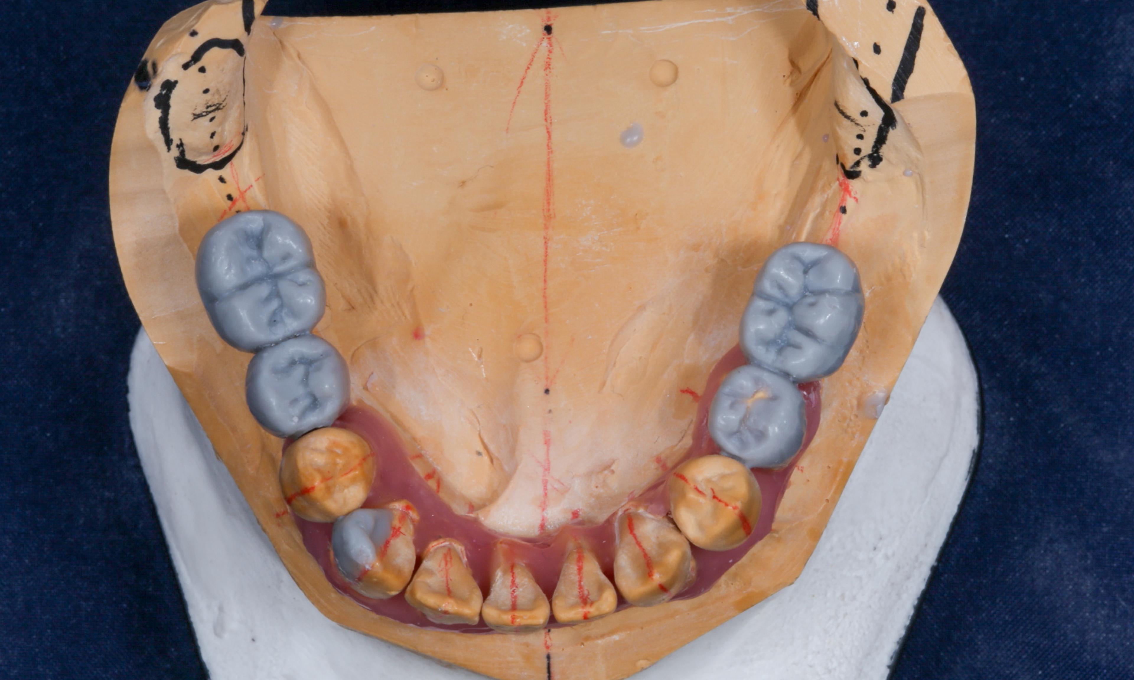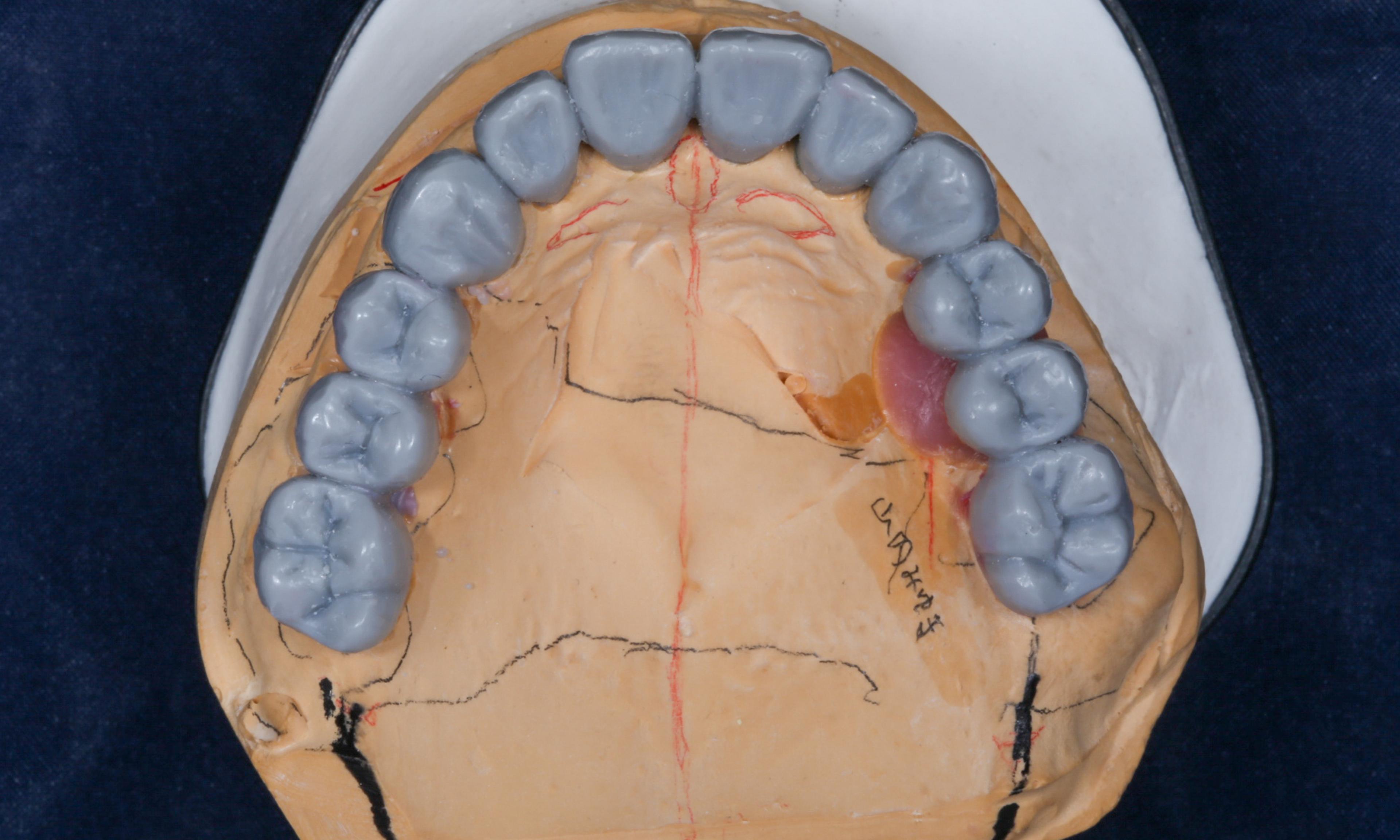 上顎は、支台歯の位置・切端の位置・臼歯関係などを考慮し並べています。切端の位置はテンポラリークラウン(仮歯)と同じにしています。