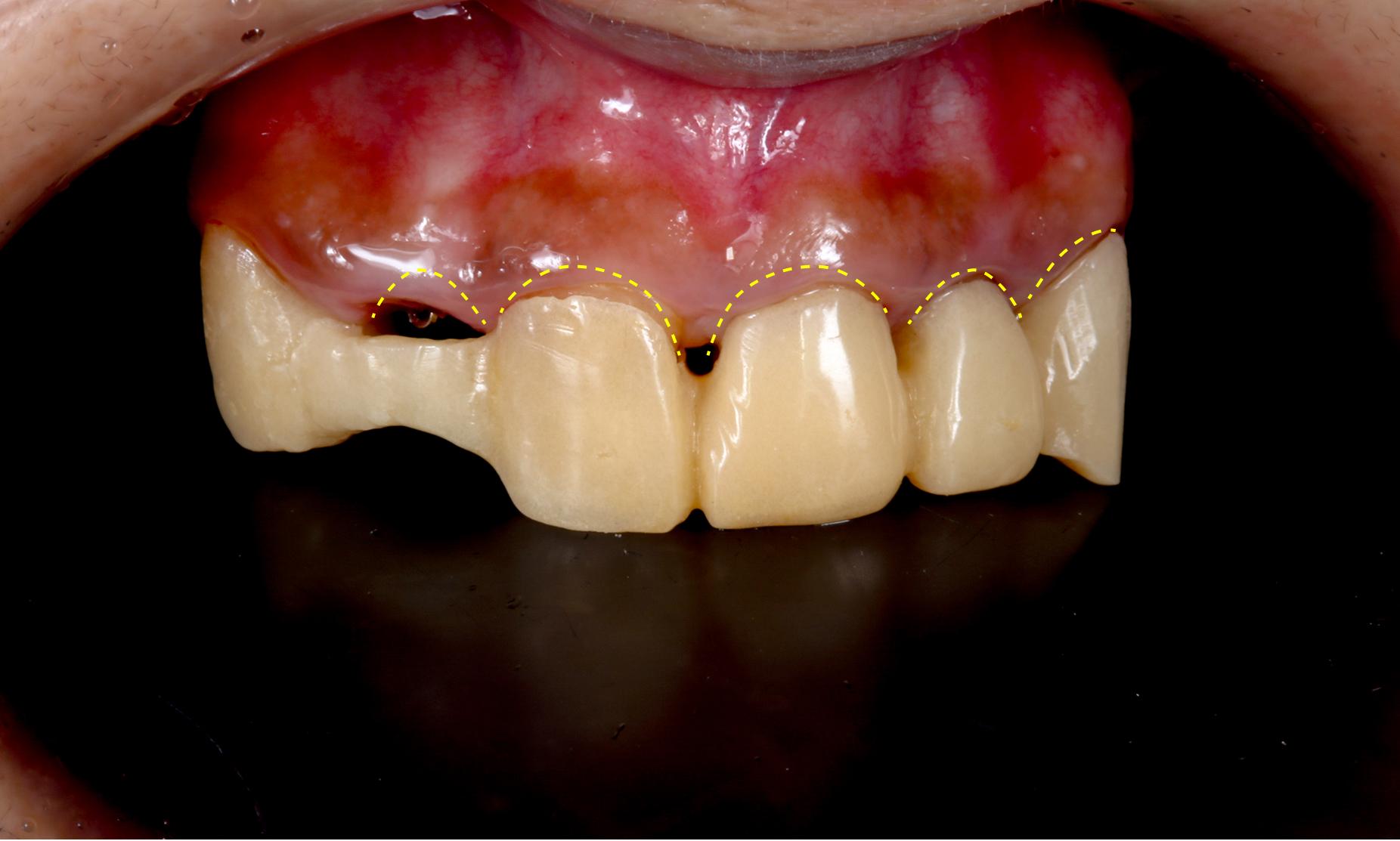 まずは上顎前歯部です。中切歯切端の位置は適正と考えましたので、それを参考に理想的な歯冠長を再現できる歯肉レベルを目標としました。