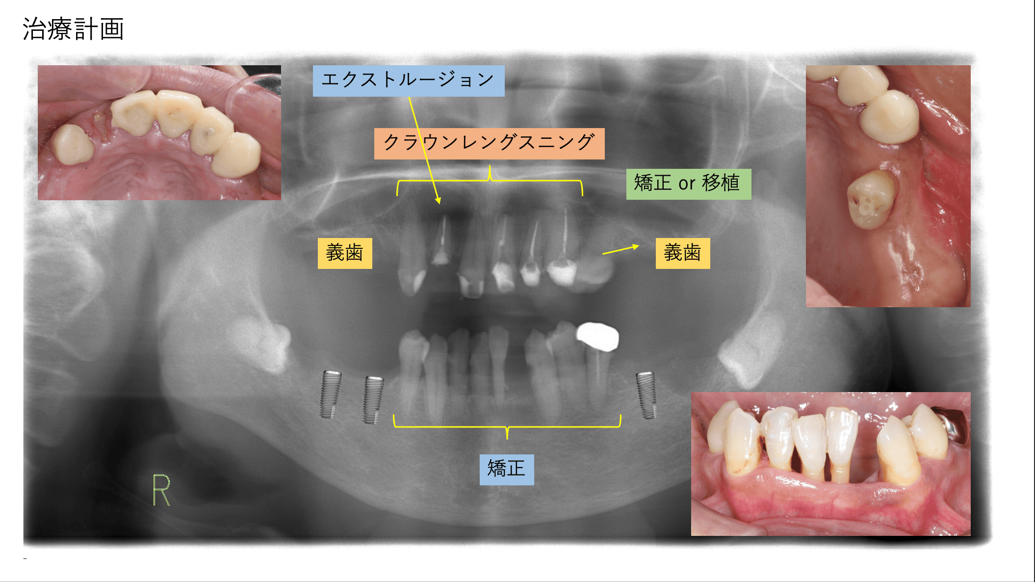 - 左上の一本だけ大きく内側に動いてしまった歯には矯正チャレンジ、難しければ移植