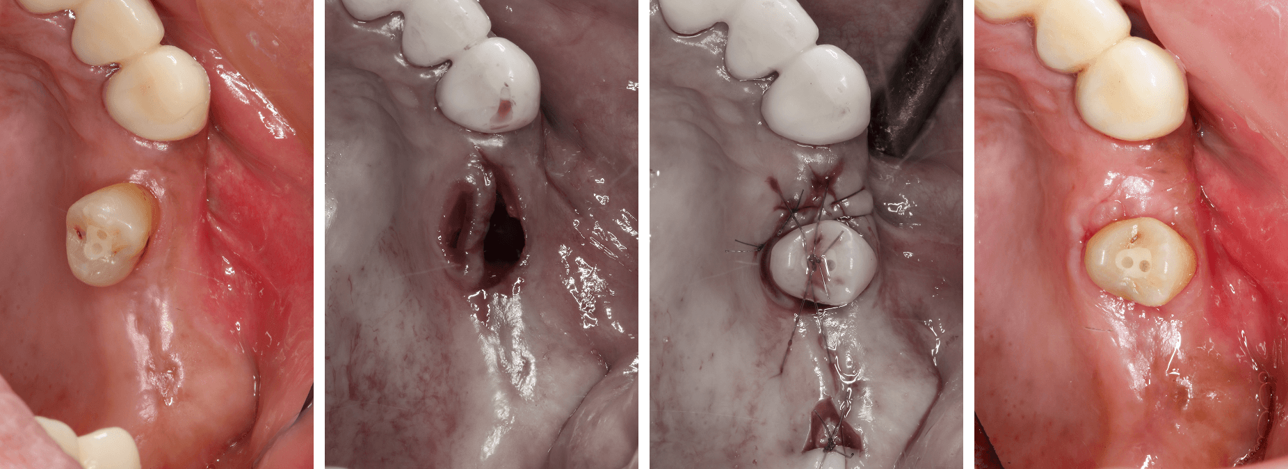 温存的にフラップを形成、抜歯窩よりソケットリフトを行い、レプリカを試適しながら骨整形を行いました。その後、保管しておいたドナー歯を設置、近心部のキャップにはFGG(遊離歯肉移植術)を行い、血餅の保持をサポートするようにしています。