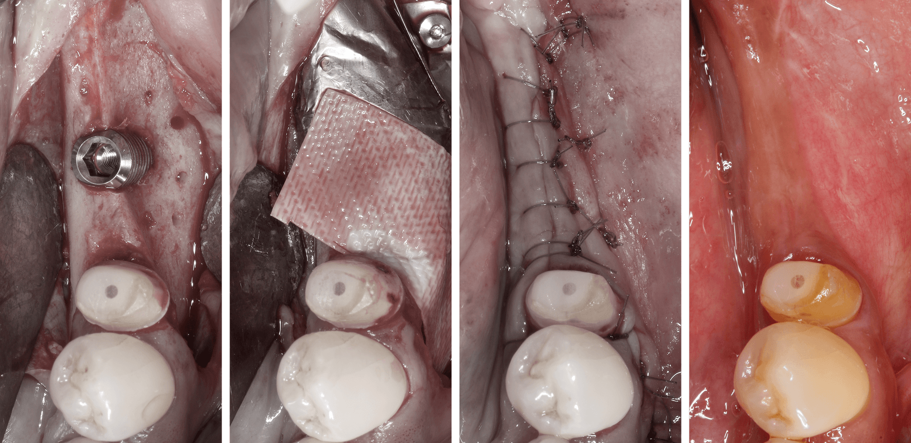 理想の位置にインプラントを埋入しました。写真でも分かるように、このときに頬側の骨が足りなくなるのはCTによるシミュレーションであらかじめ予測済みです。そのためインプラント手術と同時にGBR(骨再生誘導法)、自家骨移植によって骨再生も行います。