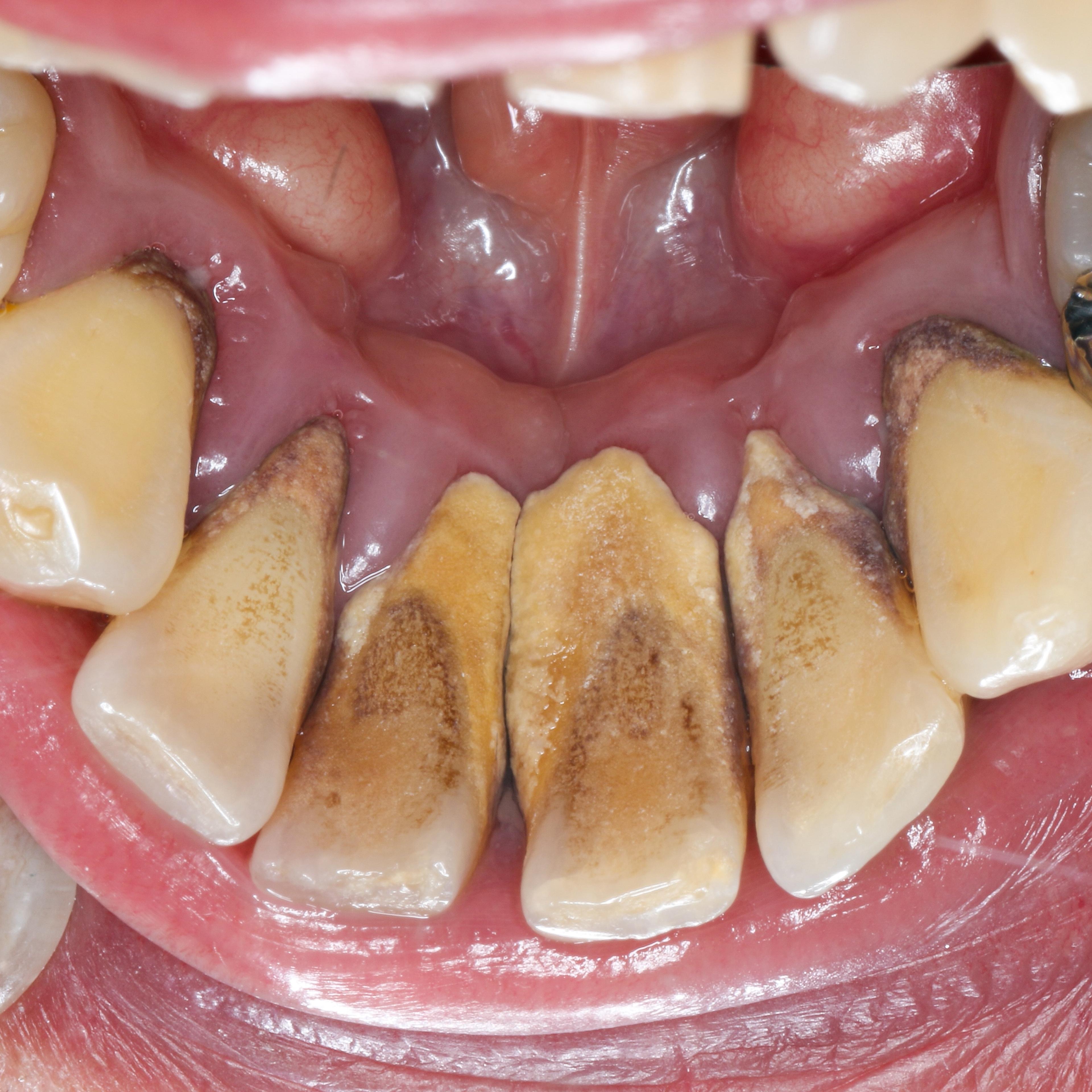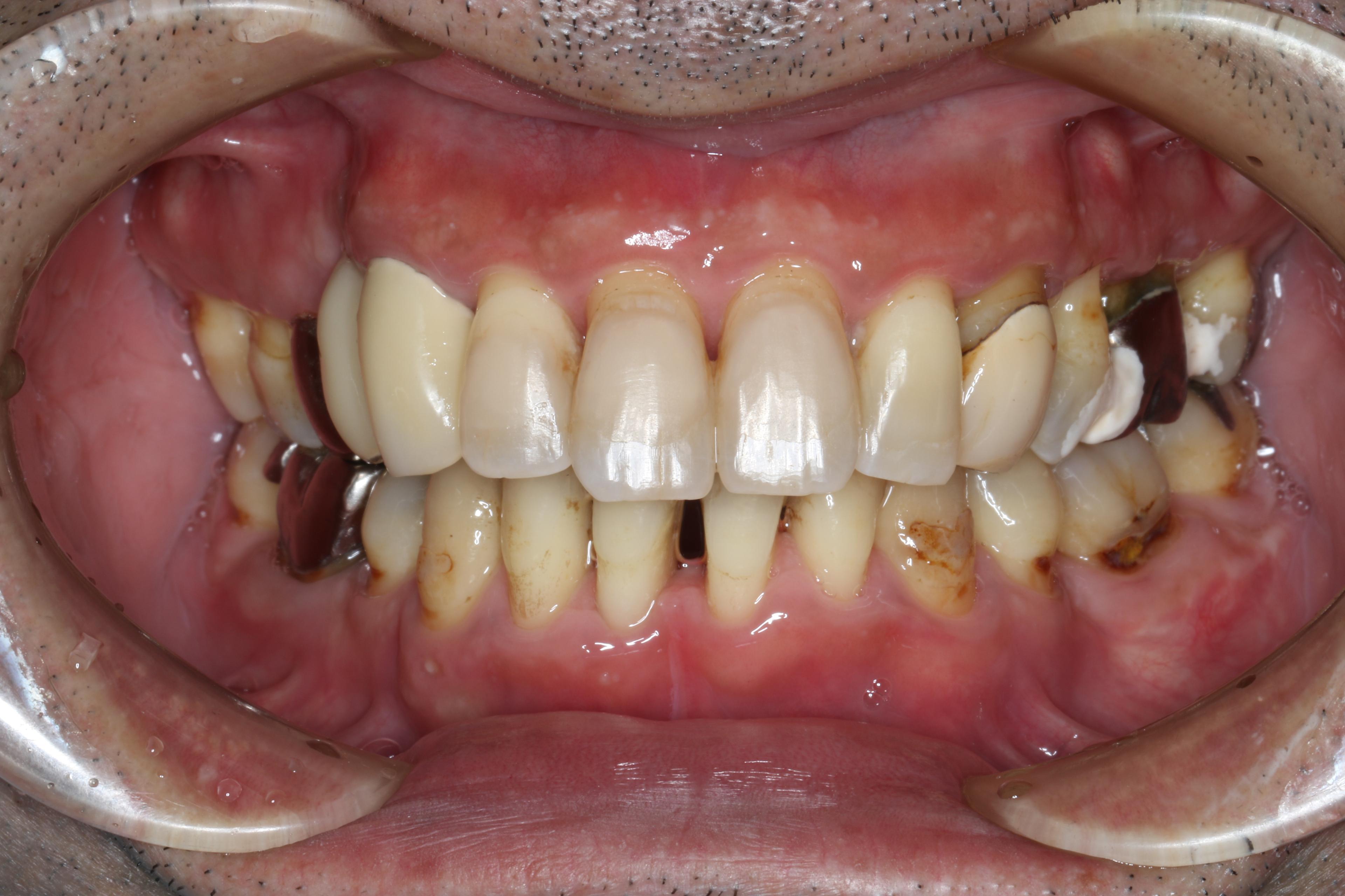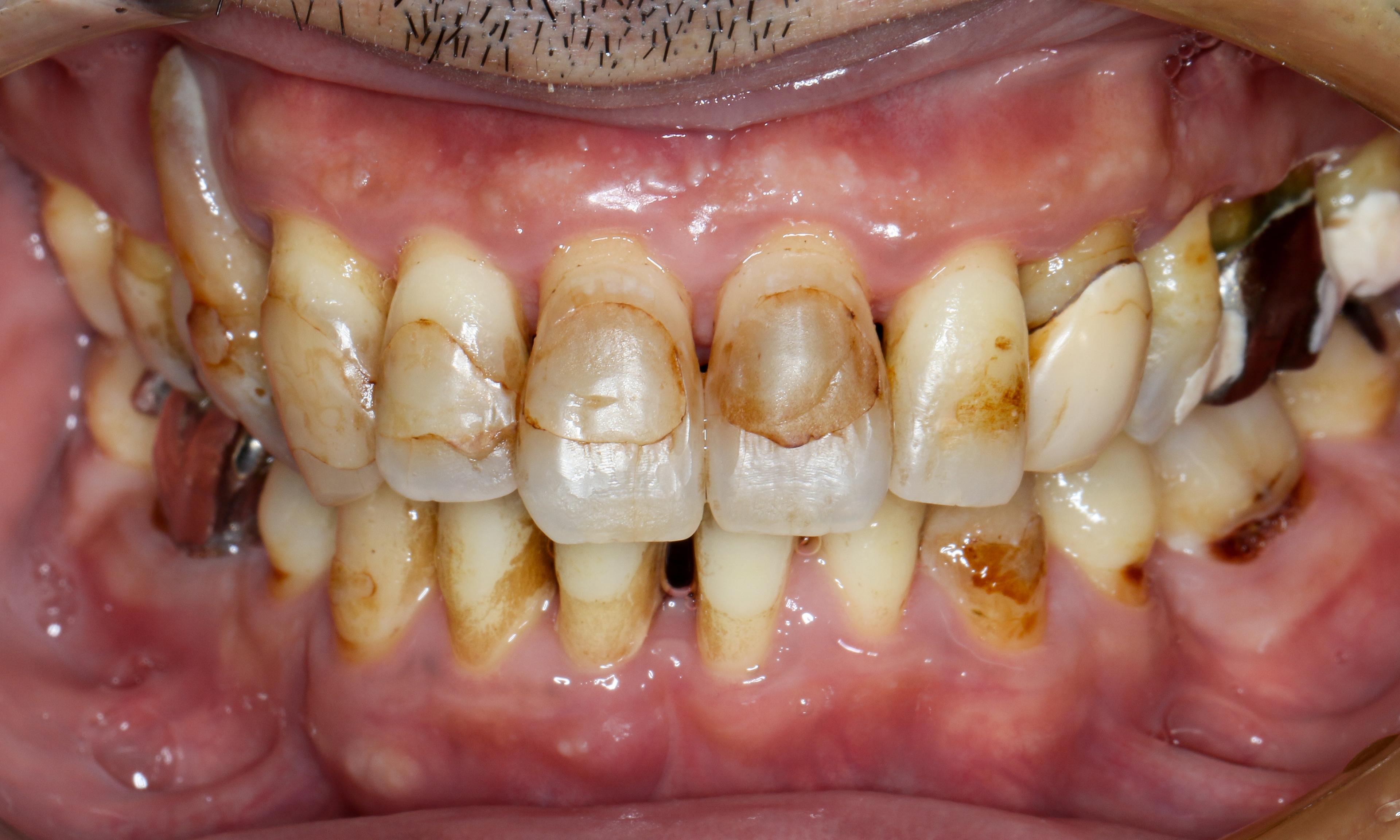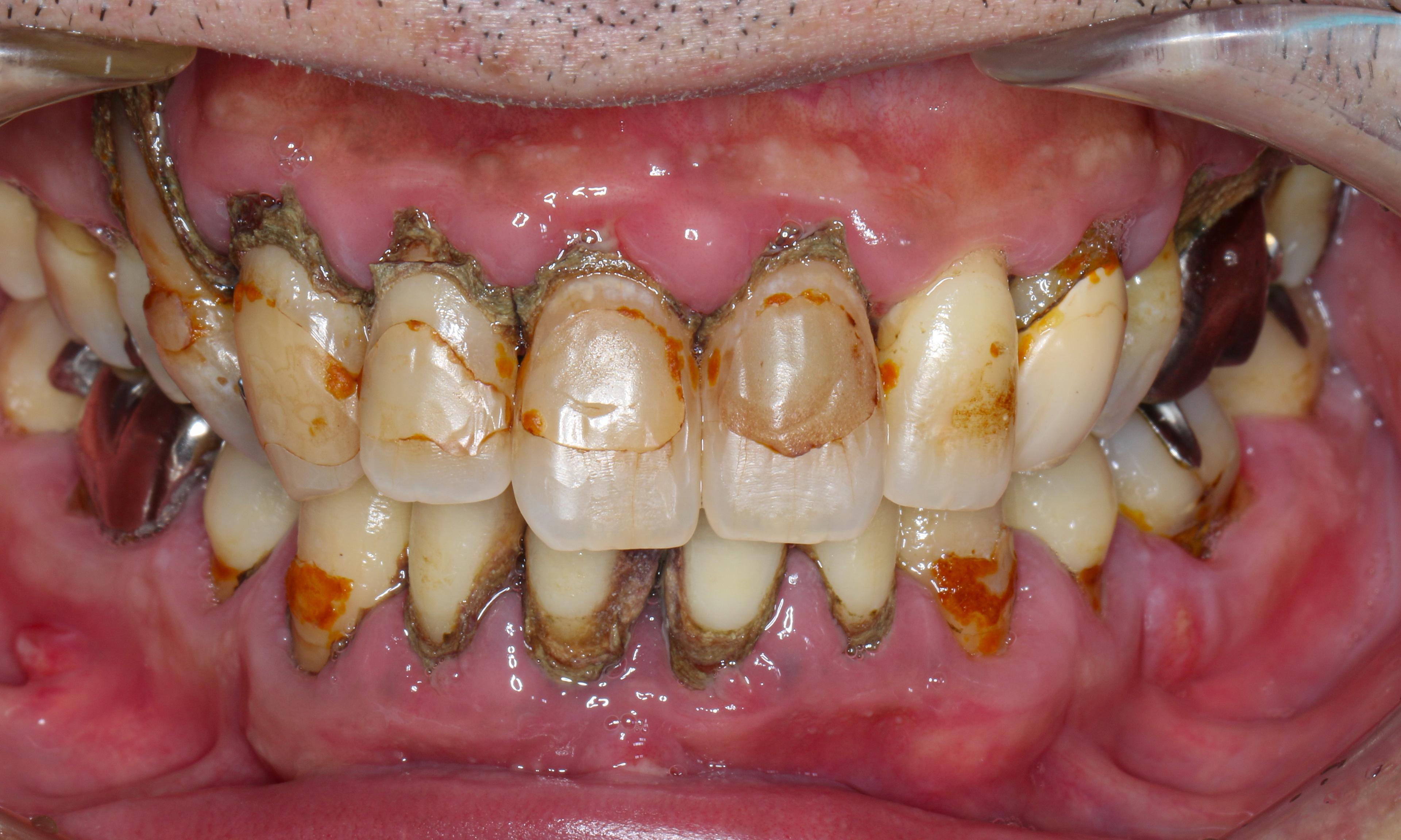 指数病の治療をしたいということでご来院された40代の男性です。写真で分かるとおり歯石がびっしりと着いており歯周炎により歯茎の腫れも相当ある状態でした。