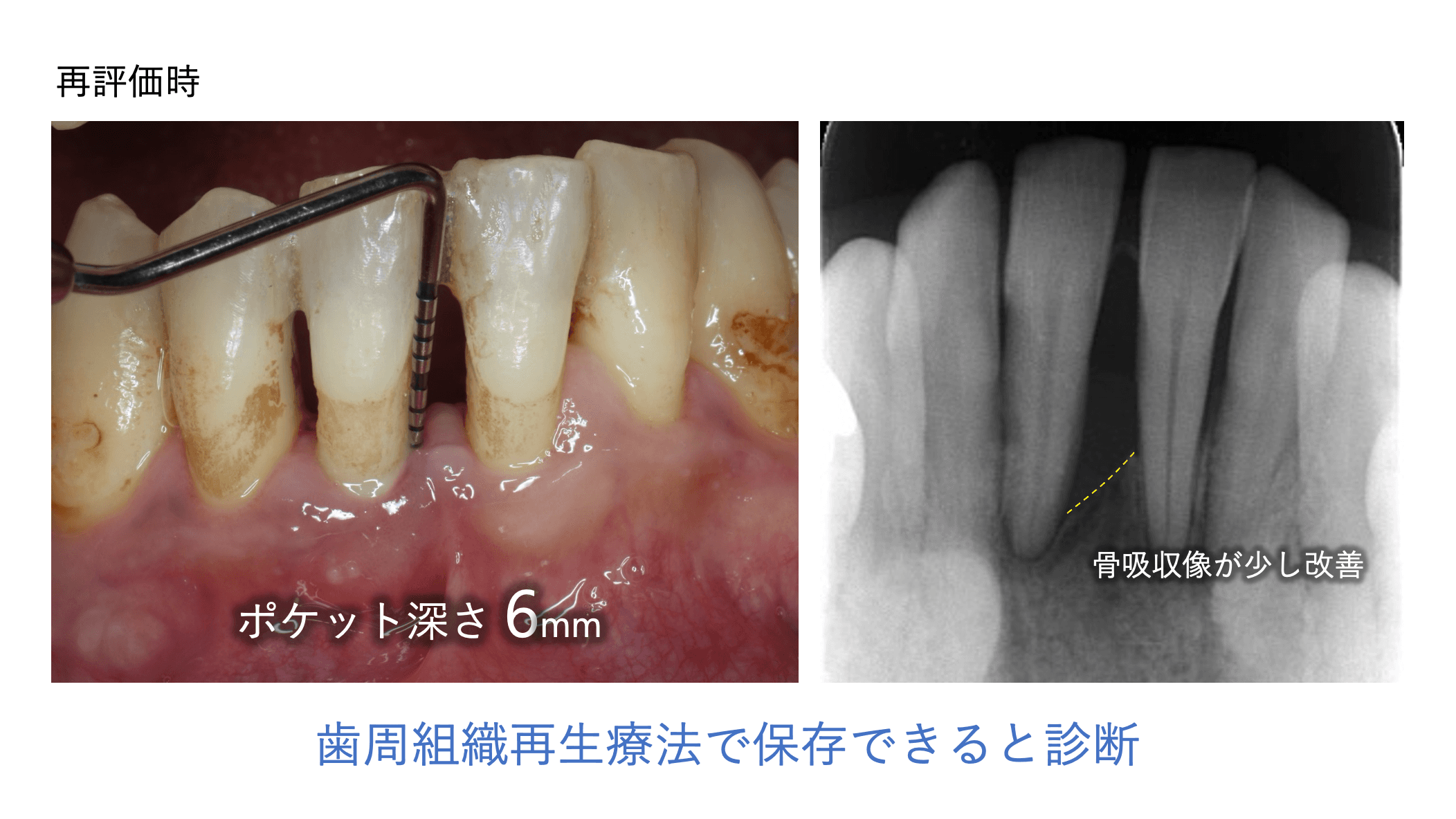 初診時と比べて歯周ポケット深さは6mmまで改善し、歯周組織再生療法により抜歯を回避できると判断できるまで回復をしています。