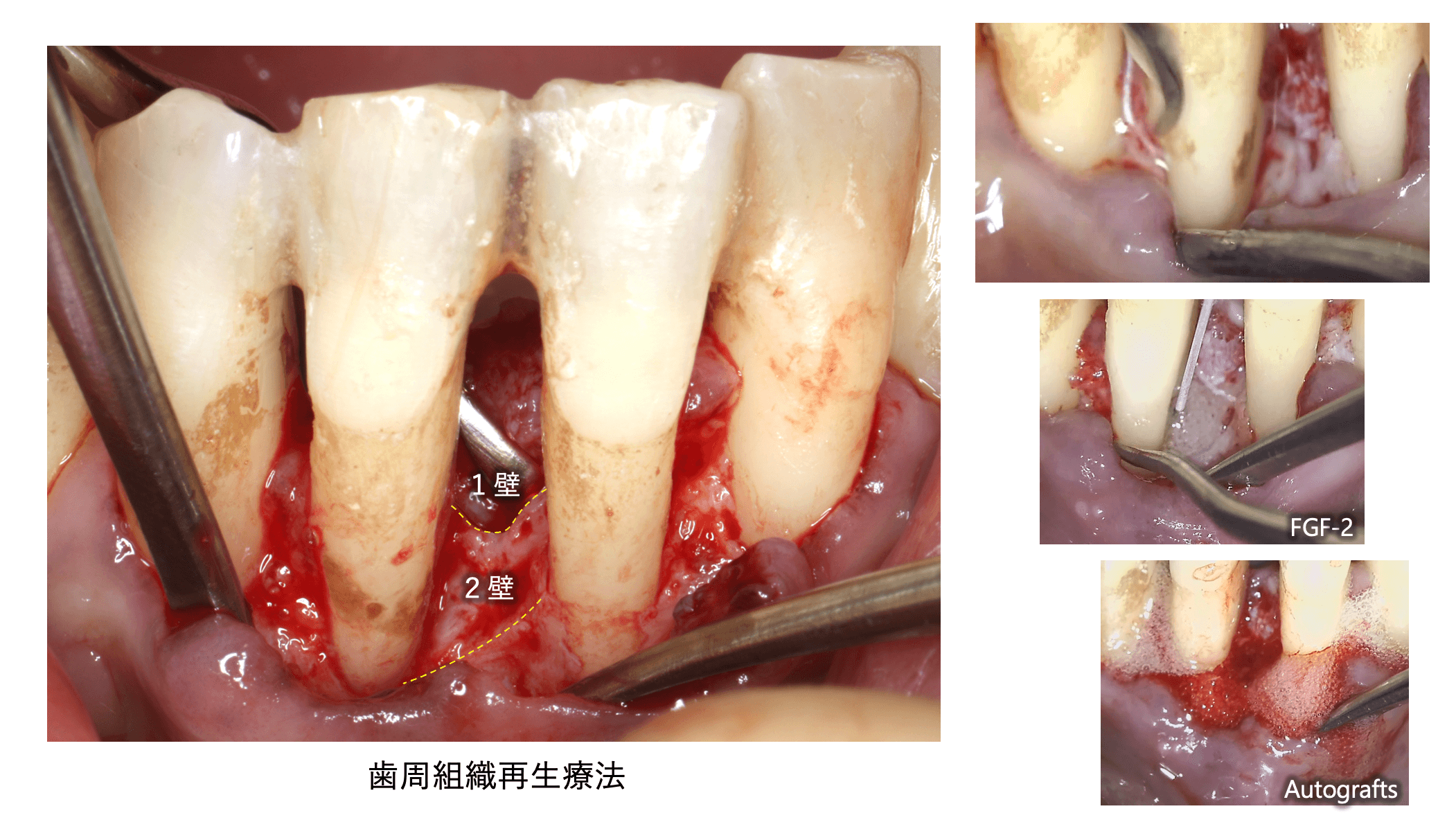 マイクロスコープを用いて根面のデブライドメントを行い、リグロス(歯科の再生治療において健康保険が使える唯一の薬剤)と自家骨を充填して縫合します。